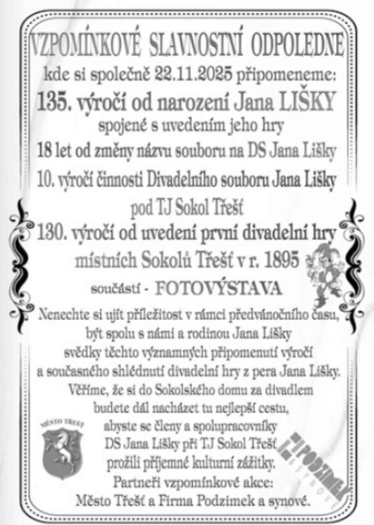 VZPOMÍNKOVÉ ODPOLEDNE DS JANA LIŠKY, SOKOLA A MĚSTA TŘEŠŤ